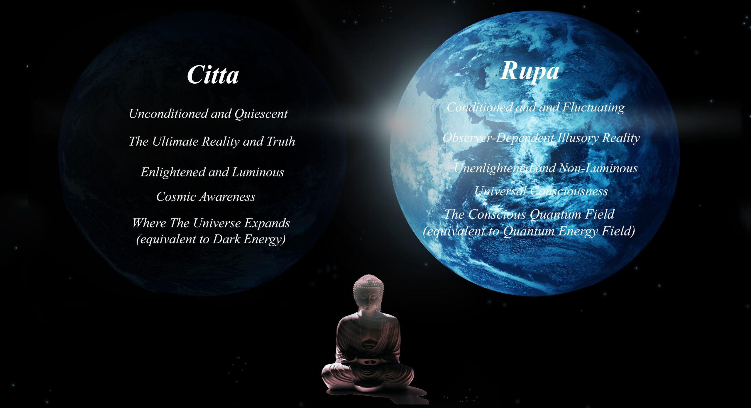 Through Direct Perception, Buddha teaches that the cosmos is a Three-Body Structure in which there is no energy, only mentality. There, humans can have consciousness, and nothing is mysterious or problematic. Not only is “Dark Energy” identified as the Ultimate Reality, but the quantum energy field is conscious. There are no Newtonian-style atomic particles only epiphenomena where Buddhism and Science meet, “What Exist?” is answered, Consciousness Is Not The Ultimate Reality, “Cosmological Constant Problem” does not exist, “The Mind-Body Problem,” is resolved, “The Central Mystery of Quantum Mechanics” is explained, and “Why Is There Something Rather Than Nothing” is clarified.